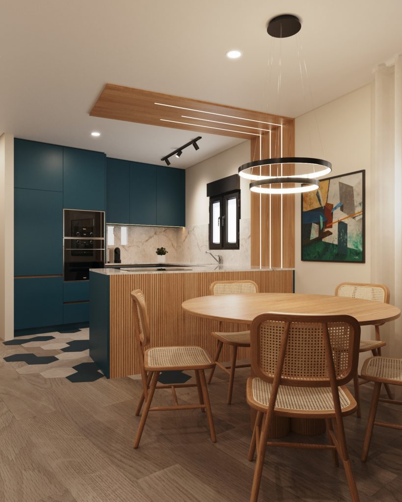 Funcionalidade aluada ao design num ambiente moderno vibrante e cheio de personalidade.A combinação de tons intensos linhas contemporâneas e iluminação estratégica trouxe vida e profundidade à cozinha, criando um lugar perfeito para cozinhar, receber e inspirar.