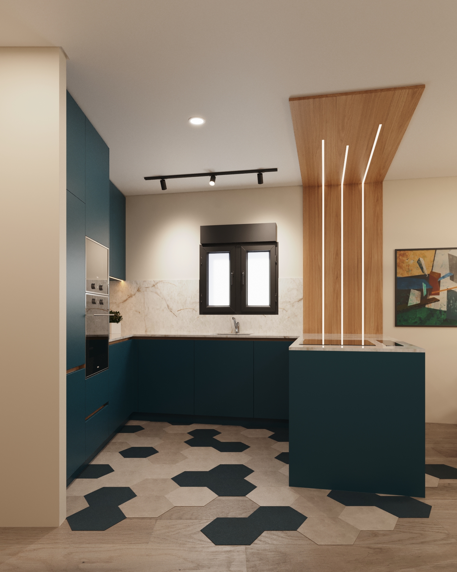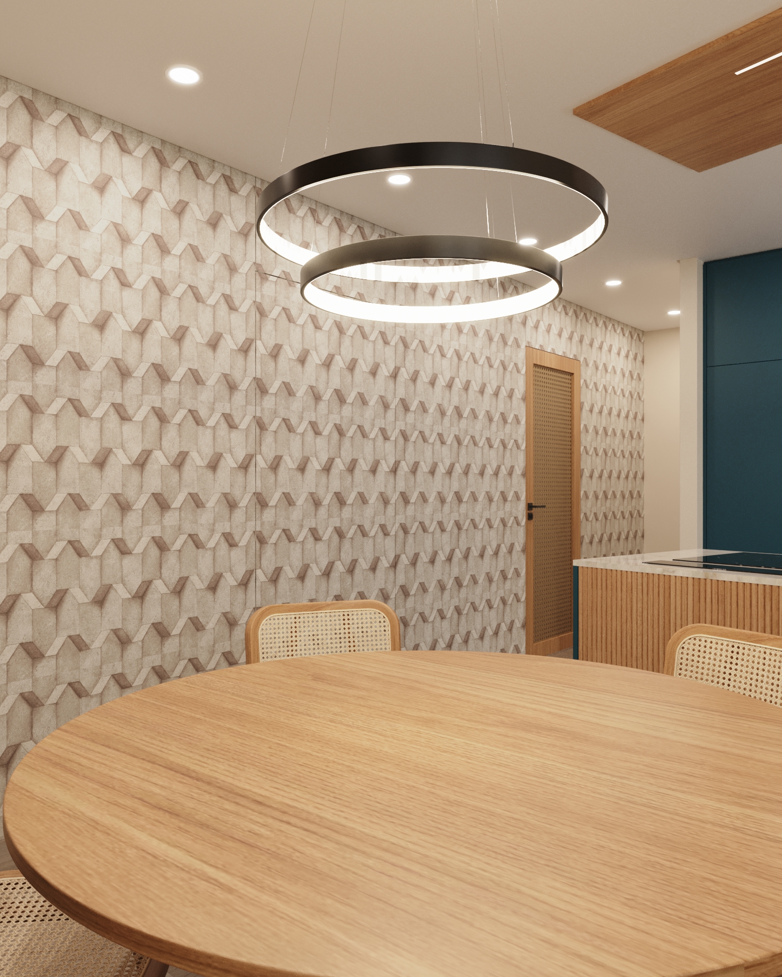 A combinação de tons intensos linhas contemporâneas e iluminação estratégica trouxe vida e profundidade à cozinha, criando um lugar perfeito para cozinhar, receber e inspirar.